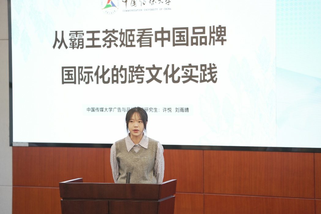 世界杯直播在线观看广告与品牌学院研究生许悦,通过中国本土品牌“霸王茶姬”看中国品牌国际化的跨文化实践。她提出中国品牌应当通过符号的“本土化转译”降低跨语境互动门槛、通过KOL完成符号的分层覆盖触达不同消费者群体、通过体验完成符号的沉浸互动深化意义认同,以“霸王茶姬”为传播范本,助力中国品牌出海。