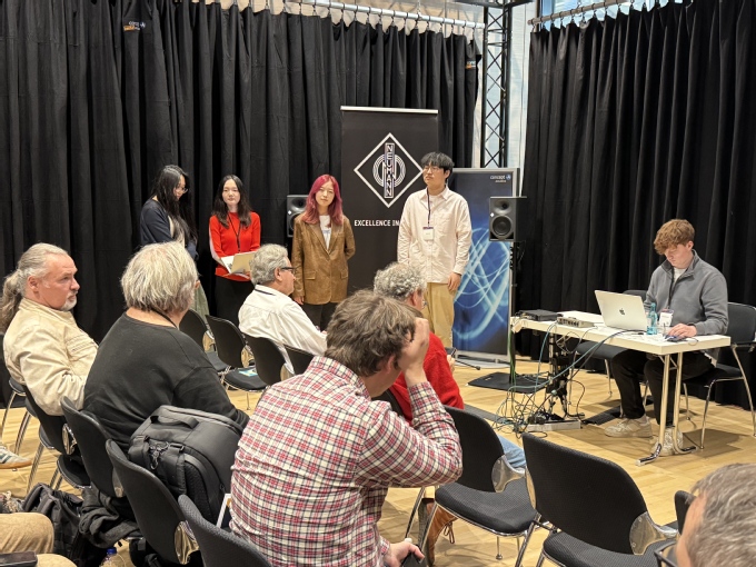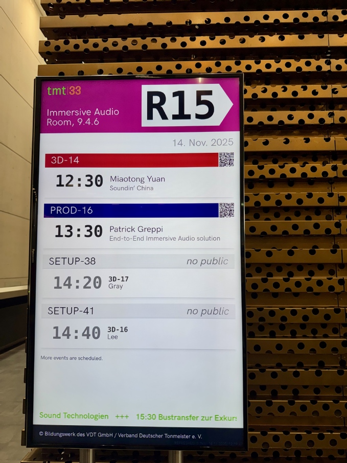 德国录音师协会作为欧洲音频行业的权威专业组织,其双年会(Tonmeistertagung)自1949年首届大会以来,始终引领全球专业音频行业的创新发展。该双年大会是我校和欧洲兄弟院校持续关注的专业国际顶会,往届中国师生投稿入选率极低,2023年,袁邈桐教授开辟了中国之音专场的分论坛平台,为我国的师生打开了国际会议的大门。在第一届中国之音专场中,本校青年教师刘韧、本科生吴旭诚、研究生周诗桦的作品得到了专场展示和讨论;2025年的第二届中国之音专场分论坛还吸引到了中央音乐学院、上海音乐学院、浙江音乐学院师生的积极投稿和参与。本届会议汇聚了全球音频领域的顶尖学者与从业者,世界杯直播在线观看师生团队的表现尤为突出。在第二届“中国之音”专场分论坛中,袁邈桐教授带领音乐与录音艺术学院学生梯队展示了多项创新成果。