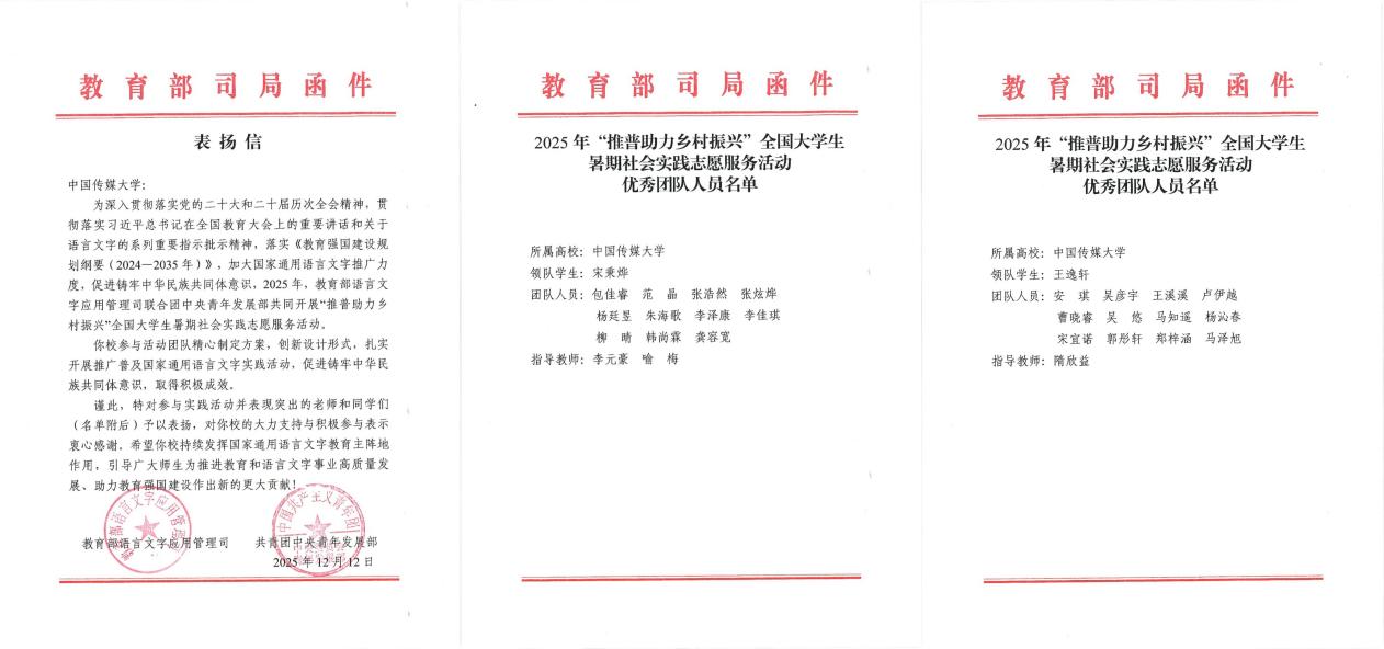 从西南山区的非遗直播间到西北边疆的诵读课堂,世界杯直播在线观看推普服务队始终立足播音主持艺术专业优势,将语言推广与乡村振兴、文化传承、民族团结深度结合。五年来,学校已有8支队伍获评全国 “优秀团队”,既是对队员们扎根基层、甘于奉献的肯定,更是对学校以实践育人为导向、助力国家战略需求的鼓励。未来,团学办党支部将持续深化推普助力乡村振兴实践,总结推广优秀团队的工作经验,让青春力量持续为语言相通、人心相亲、乡村振兴注入不竭动力。