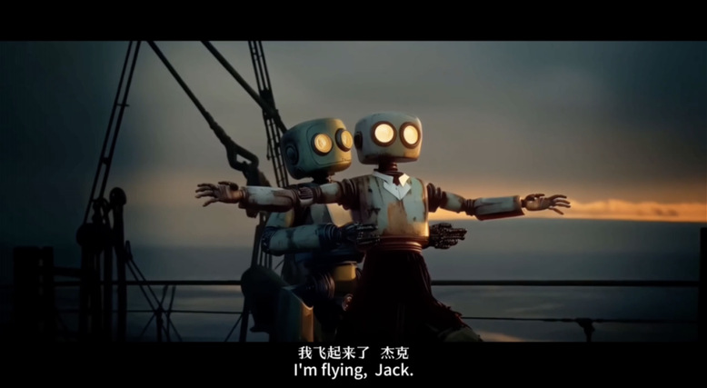 作品介绍:这是一部由AIGC技术驱动制作的科幻爱情实验短片,以未来机器文明为背景,探讨机器人对爱情与生命的哲学思考。影片戏仿经典爱情电影名场面,将人类主角置换为机器人,讲述硅基生命模仿碳基情感、试图破解生育率危机的故事。创作团队运用AI语言与视觉大模型,融合多元美学风格,让机器人以机械动作传递情感。短片以结尾虽未解决危机,却让爱情在冰冷机械中绽放浪漫温度,致敬电影史的同时、诗意叩问AI时代的人性与技术。