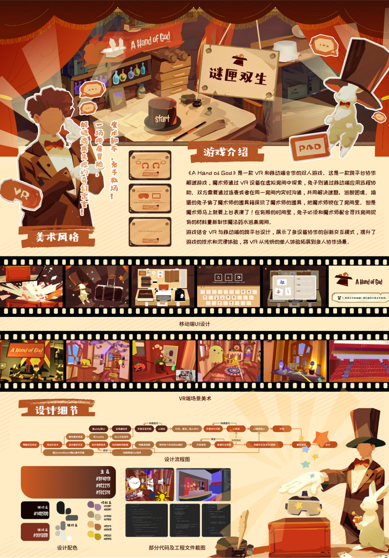 作品介绍:《错位拍档:双界逃脱》是一款融合VR与手机协作的双人解谜游戏。玩家分别扮演VR中的魔术师与手机端的兔子,实时沟通、协同解谜,在时限内制作药水逃离危机。作品以“错位”视角与多端联动设计,突破传统单人VR模式,探索了跨平台协同互动的创新可能。